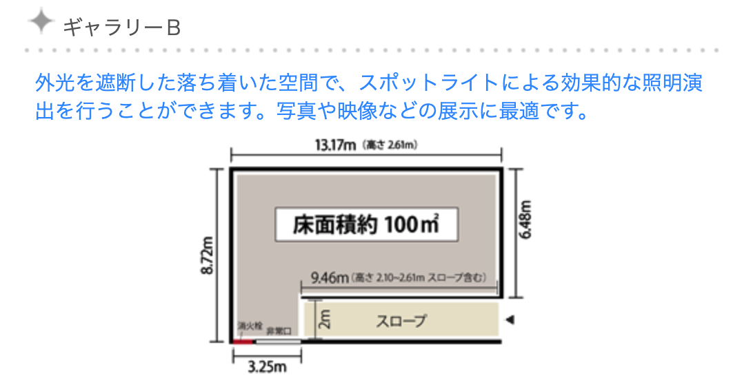 外光を遮断した落ち着いた空間で、スポットライトによる効果的な照明演出を行うことができます。写真や映像などの展示に最適です。
